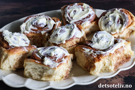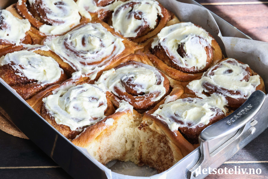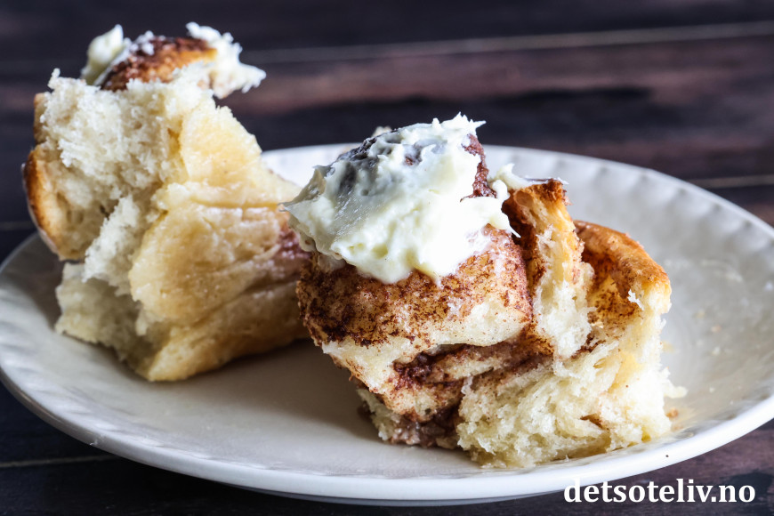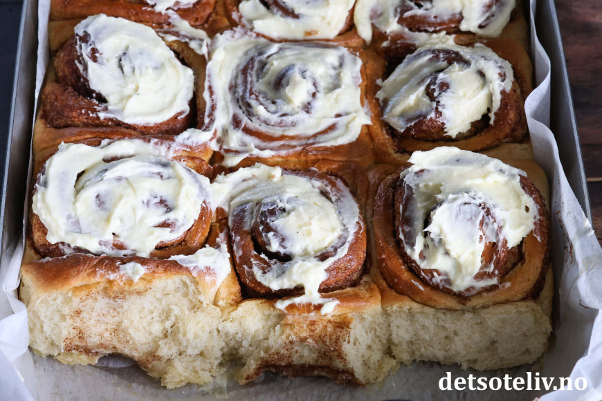 ♥ Ostekremen kan selvsagt sløyfes, men smaker veldig friskt og godt til disse søte, myke kanelbollene.