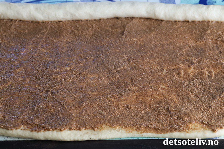 Rør sammen mykt smør, brunt sukker og kanel til fyllet. Smør fyllet over leiven og rull leiven sammen til en fast rull.