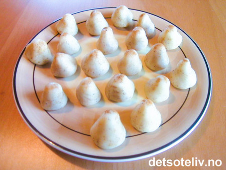 Form ønskede figurer av marsipanen, for eksempel små pyramider, som du ser på bildet. Gi eventuelt marsipanen et bittelite ekstra kaneldryss til pynt.