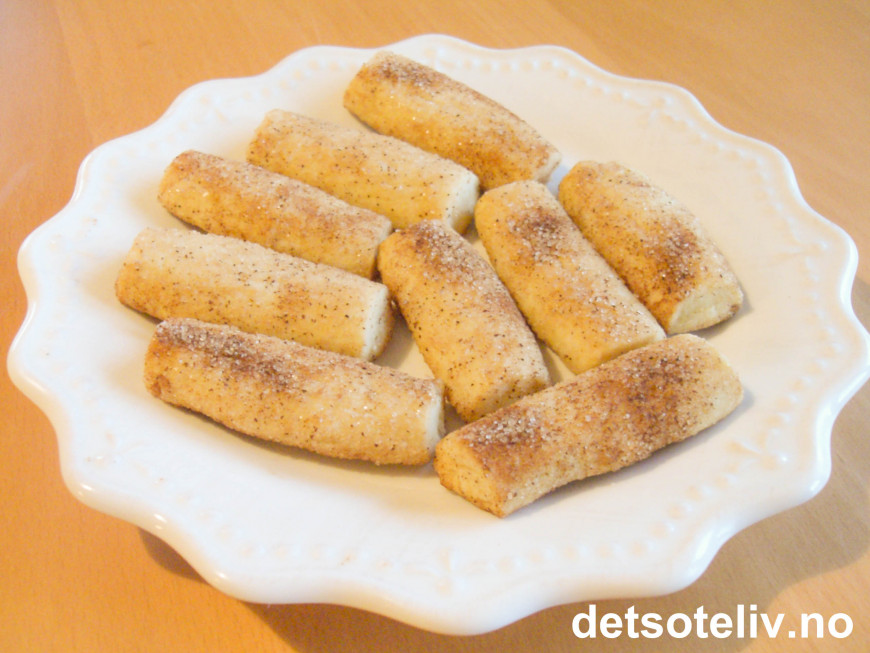 Trill ut deigen til fingertykke pølser som deles opp i ca 6 cm lange pinner. Rull pinnene i sukker- og kanelblandingen (se tips).