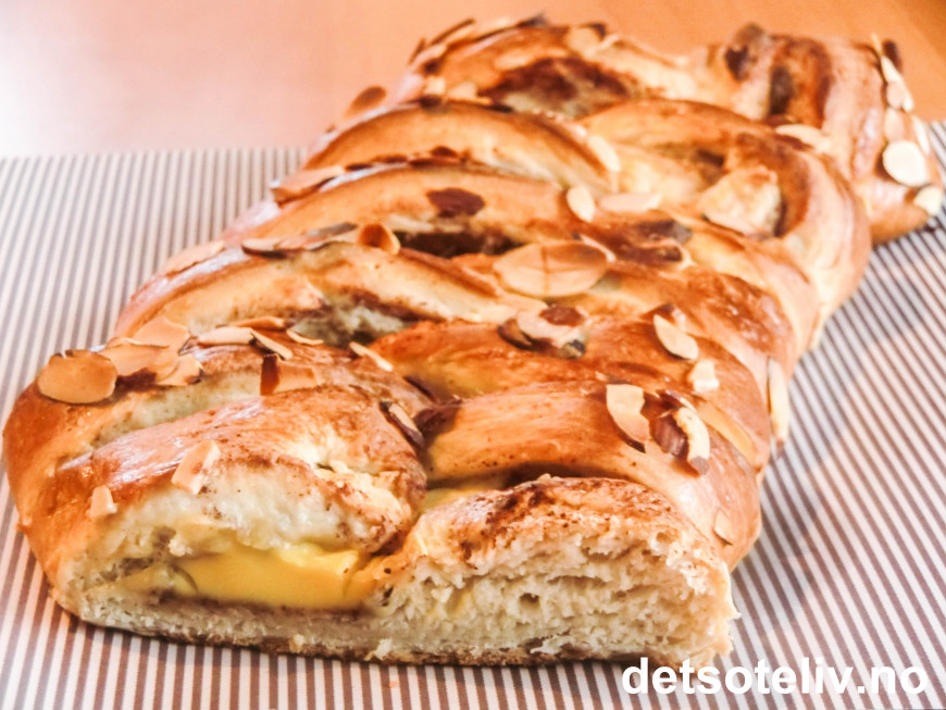 Kna sammen deigen og del den i to deler. Kjevle ut hver del til et rektangel som er ca 20x30 cm (med kortsiden vendende mot deg). Dryss over sukker og kanel. Legg så en tykk stripe med vaniljekrem i midten av hver lengde. Bruk en kniv og skjær snitter på skrå med ca 2 cm avstand på hver side av vaniljestripen. Brett så snippene med deig inn over vaniljekrem, annen hver gang fra høyre og venstre side. Prøv og lukk vaniljekremen mest mulig inne i deigen så ikke vaniljekremen renner ut av hvetestangen under stekingen.