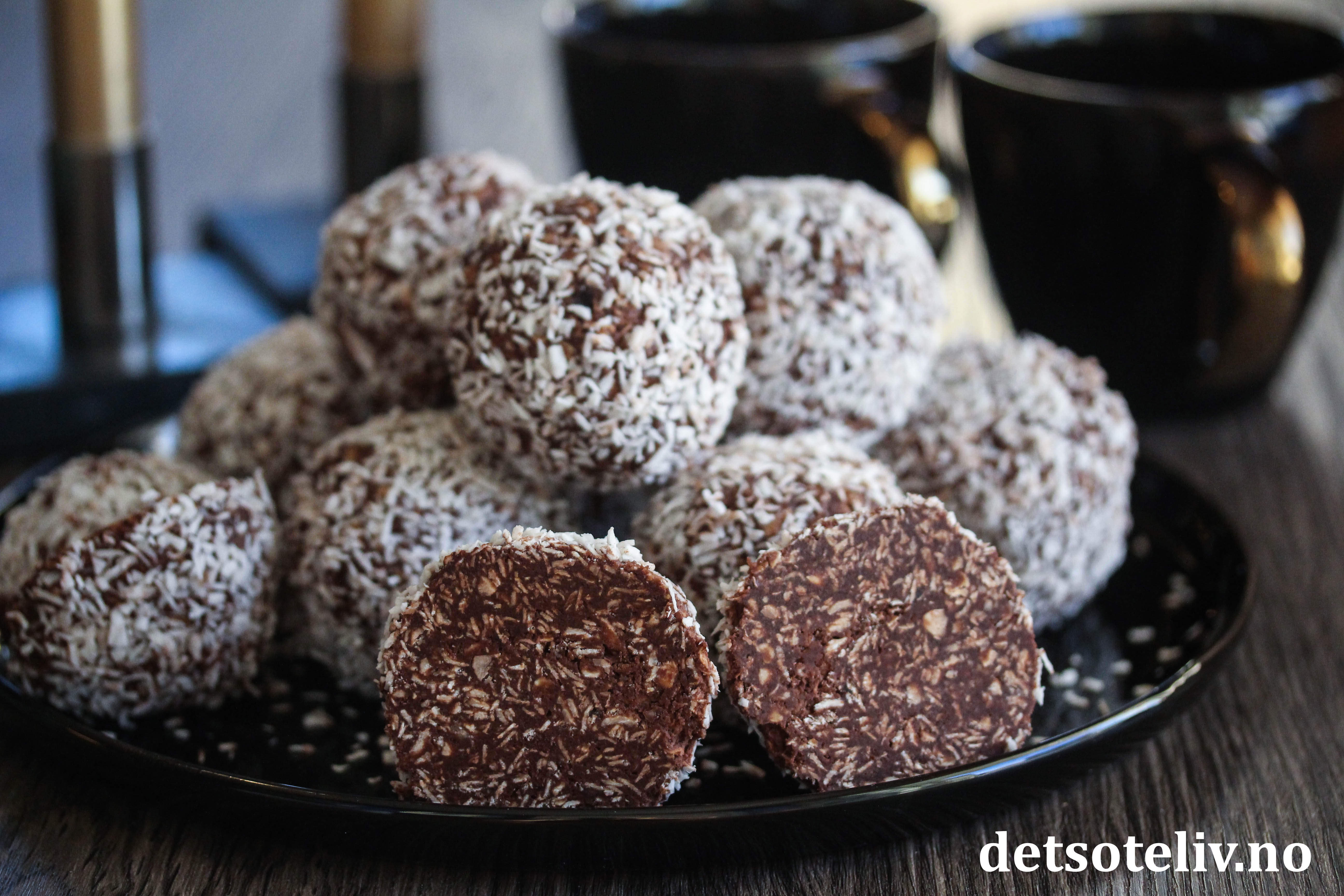 Form massen til 10 store kuler (se tips). Vend kulene forsiktig i kokos.