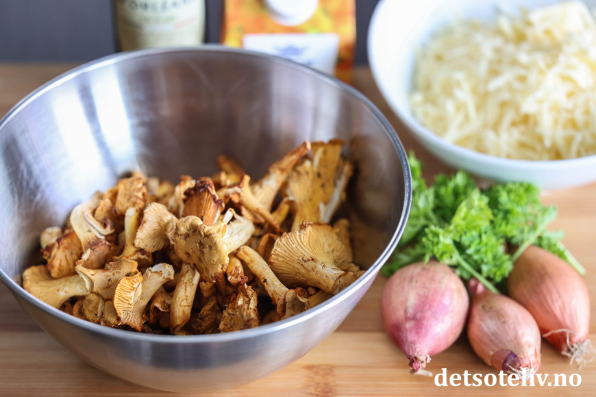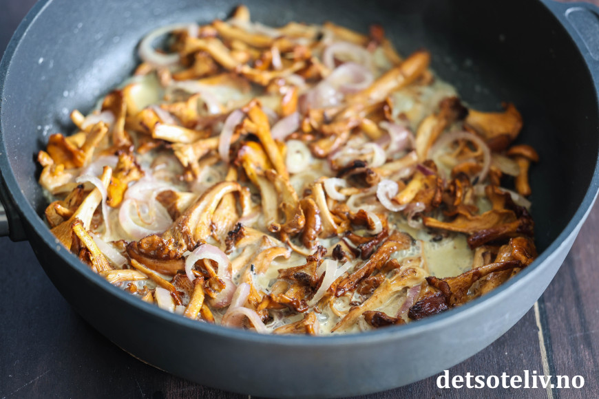 Stek kantarellene og sjalottløk på middels varme i noen minutter slik at kantarellene får avgitt væske og løken blir myk og gyllen.