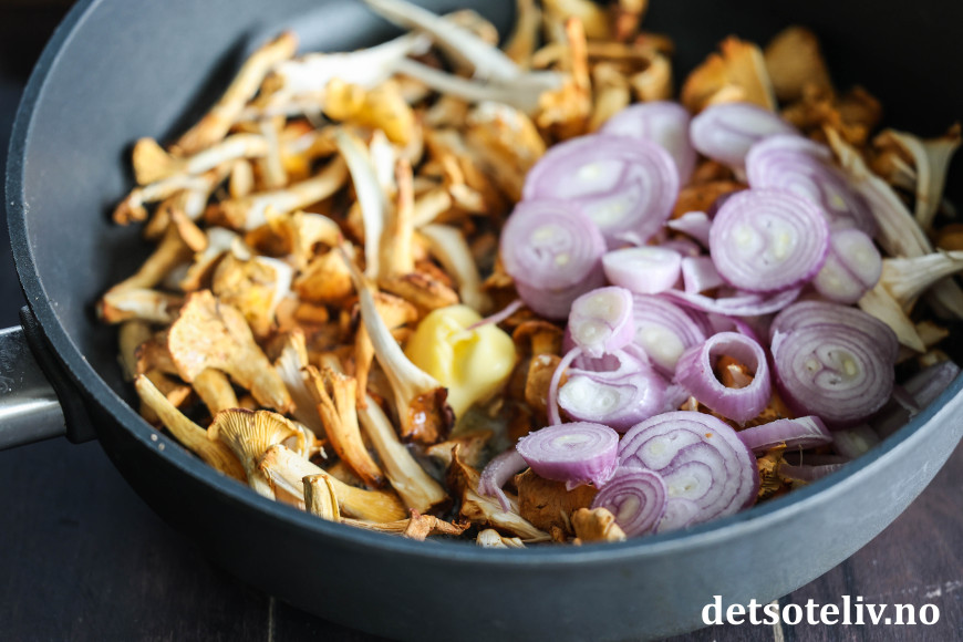 Ha smør i pannen. Stek kantarellene og sjalottløk på middels varme i noen minutter slik at kantarellene får avgitt væske og løken blir myk og gyllen.