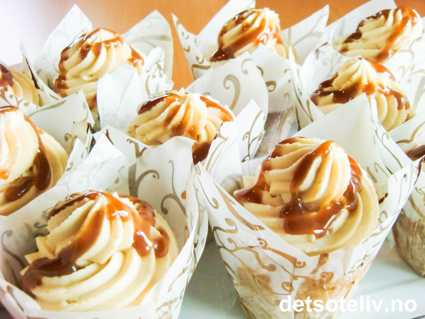 Fyll karamellkremen i en sprøytepose og sprøyt vakre topper på hver cupcake. Oppbevar kjølig frem til servering. Ringle eventuelt over litt karamellsaus på toppen av hver cupcake til pynt rett før servering.