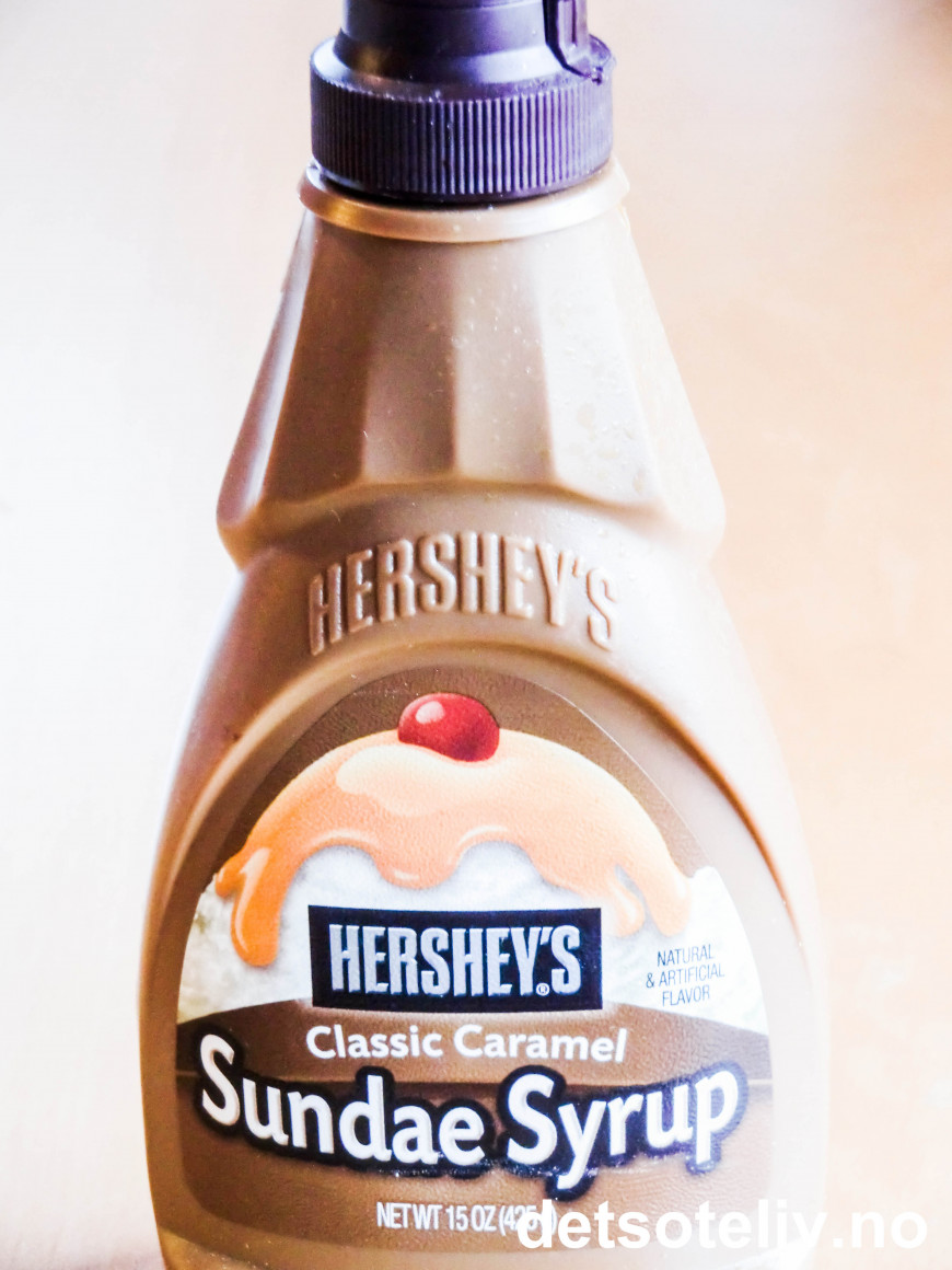 ♥ Som karamellsaus kan du enten bruke den fra Freia som fås kjøpt i de fleste norske matbutikker eller som jeg har gjort her, karamellsausen fra Hershey's som heter Classic Caramel Sundae Syrup. Begge deler selges på flaske, men den amerikanske er noe tykkere i konsistensen. Smaken på cupcakesene blir omtrent den samme.