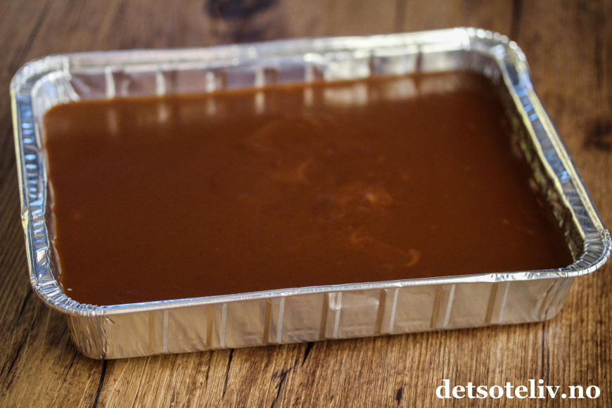 Hell den ferdigkokte karamellen i en bakepapirkledd form eller en aluminiumsform som jeg har brukt her (ca. 20 x 17 cm). La karamellen stå i kjøleskapet til den har stivnet.