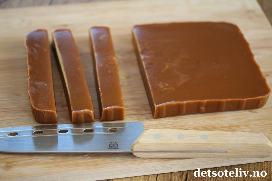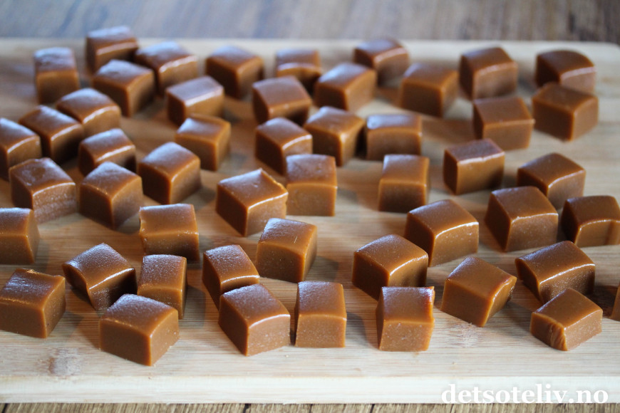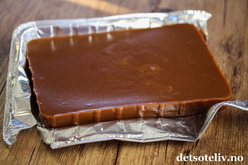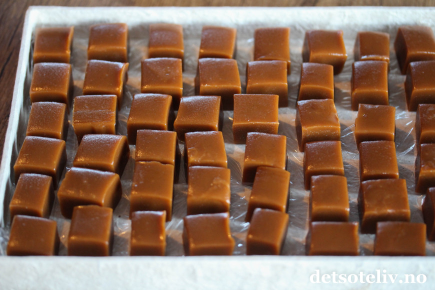 ♥ Den ferdigkokte karamellen må stå i kjøleskapet for å stivne. Det går fint å la formen stå i kjøleskapet over natten, men da kan det godt hende at karamellen blir for hard til at den kan skjæres i biter. I så fall er det bare å la formen stå i romtemperatur en stund slik at karamellen mykner igjen.