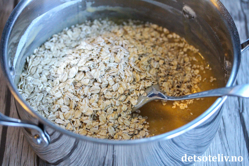 Smelt smøret til havredeigen i en kjele. Ta kjelen av platen. Bland i sirup, kremfløte og sukker. Rør så i hvetemel, bakepulver og til slutt havregryn.