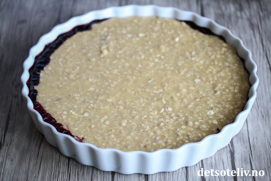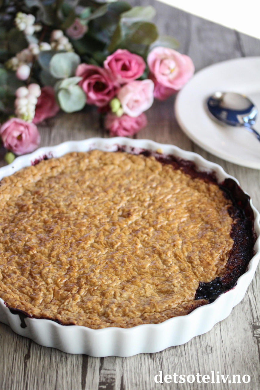 Jeg fikk lyst til å lage en blåbærvariant av Karamellisert rabarbrapai med havre, og DET ble godt det! 😍