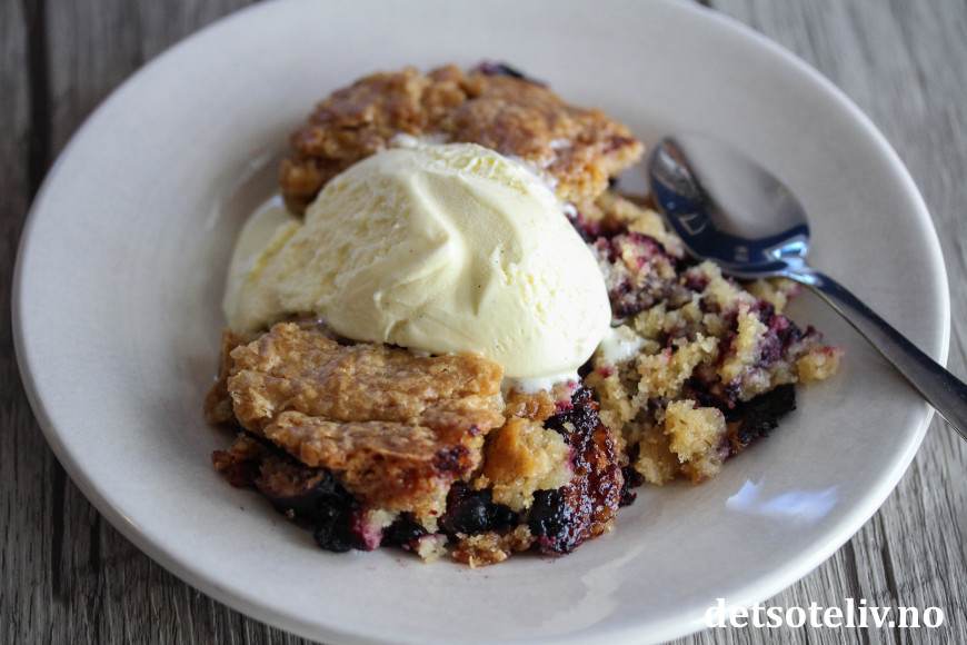 Havrelaget på toppen av blåbærene blir herlig seigt og karamellisert. Helt nydelig!