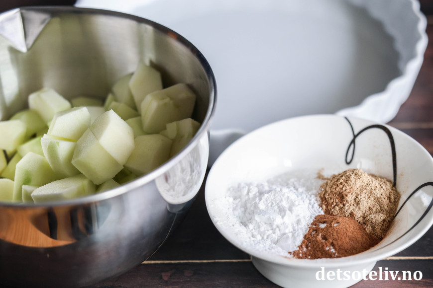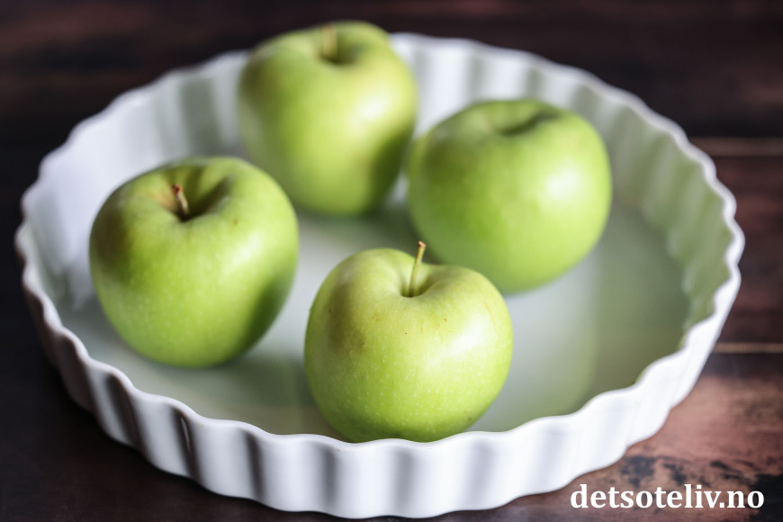 Finn frem eplene. Skrell og rens dem og del dem i store biter.