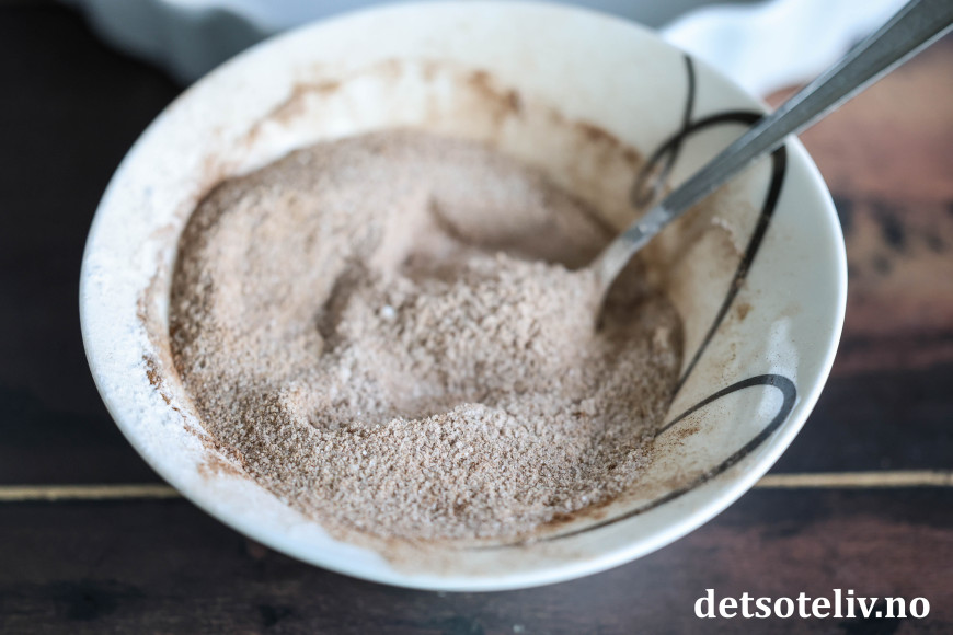 Ha sukker, potetmel og krydder i en skål. Bland dette godt sammen.