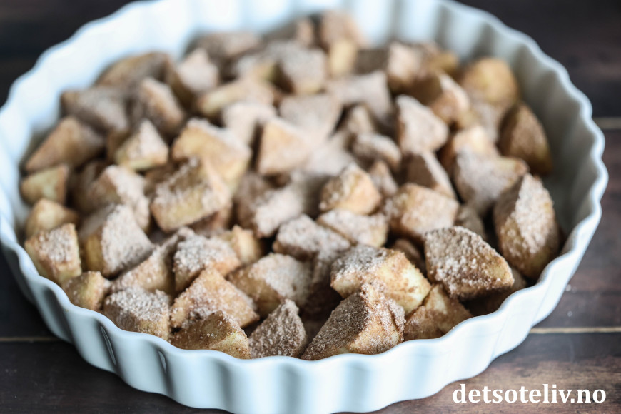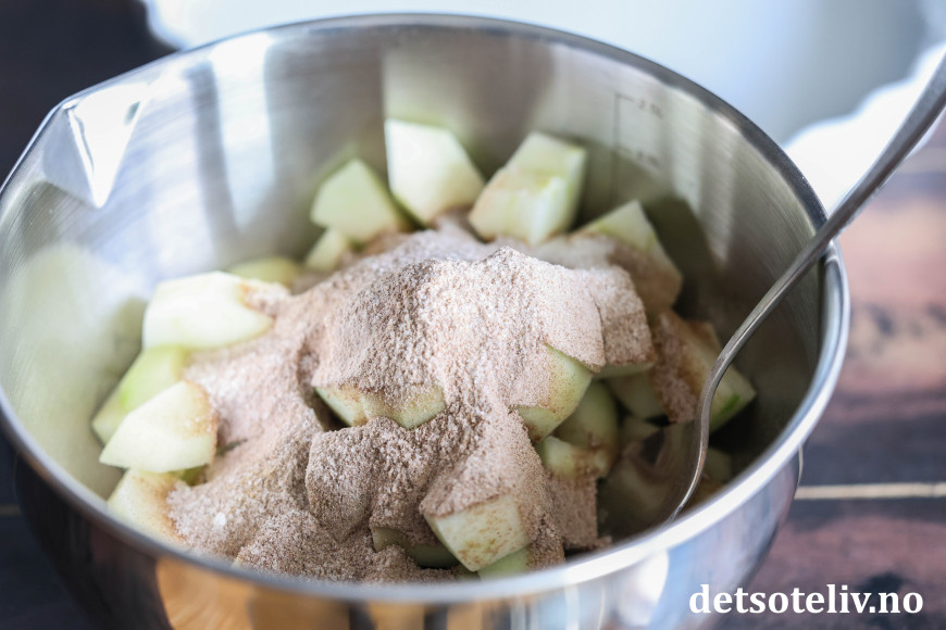 Ha sukkerblandingen deretter i bollen med eplebitene. Vend sammen.