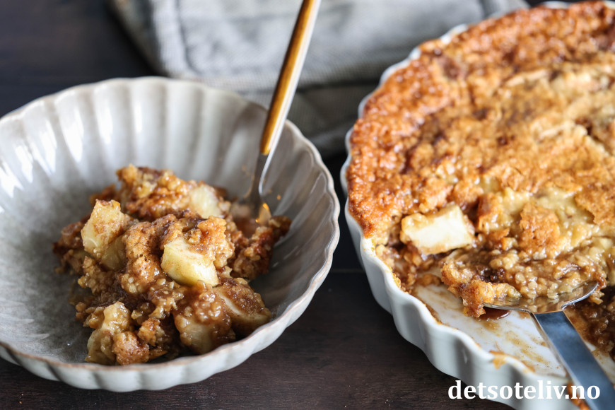 Det er noe helt spesielt med havretoppingen på denne kaken, som blir så herlig seigt, søtt og karamellisert... 😍 Veldig godt i kombinasjon med masse kanel- og kardemommekrydrede epler.