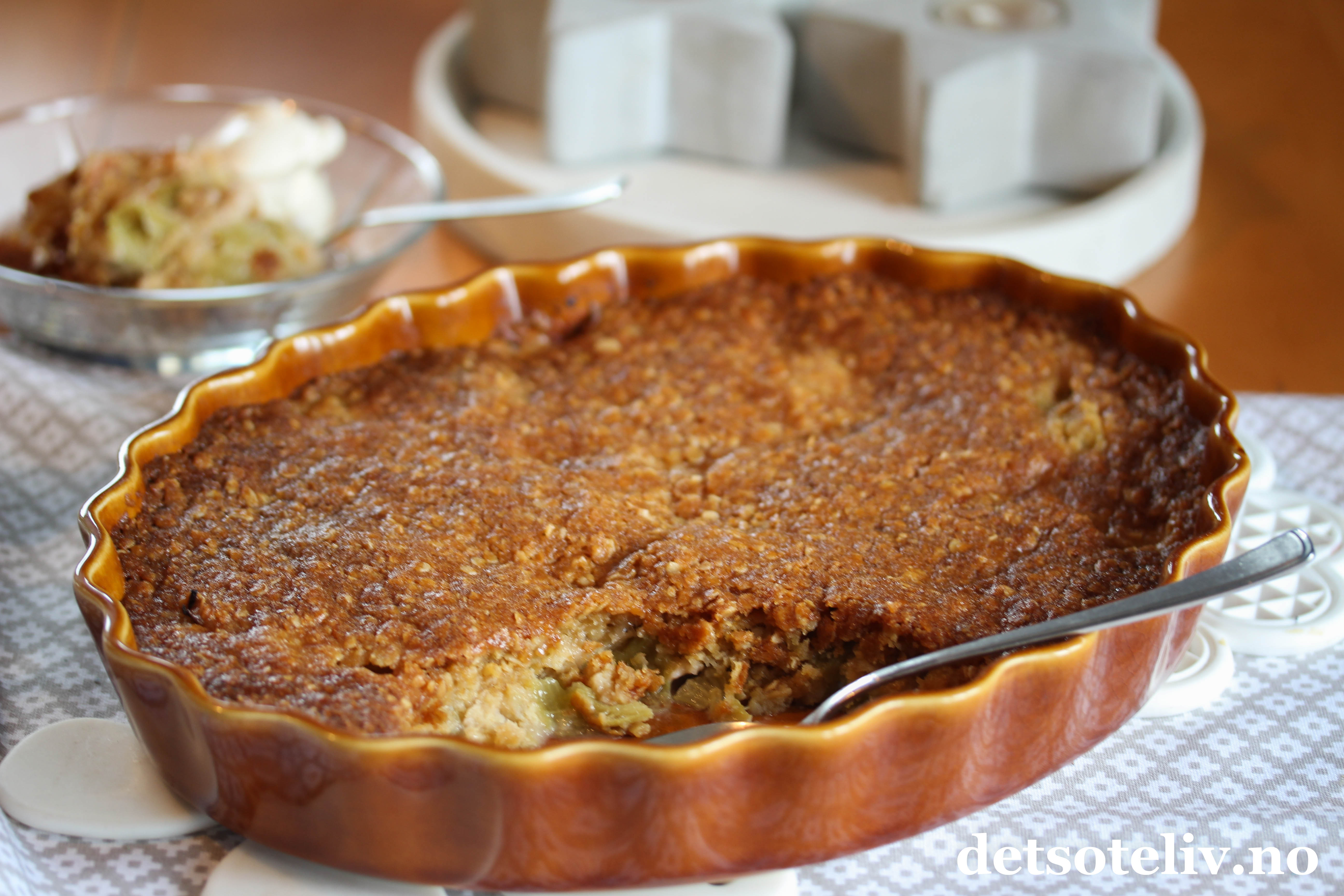 Rens rabarbra og del i biter. Ha dette i en ildfast form (ca 26 cm i diameter). Strø over sukker.