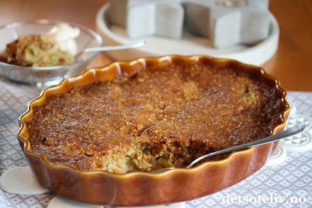 Fordel deigen over rabarbraen. Stek kaken midt i ovnen ved 175°C i 40 minutter.