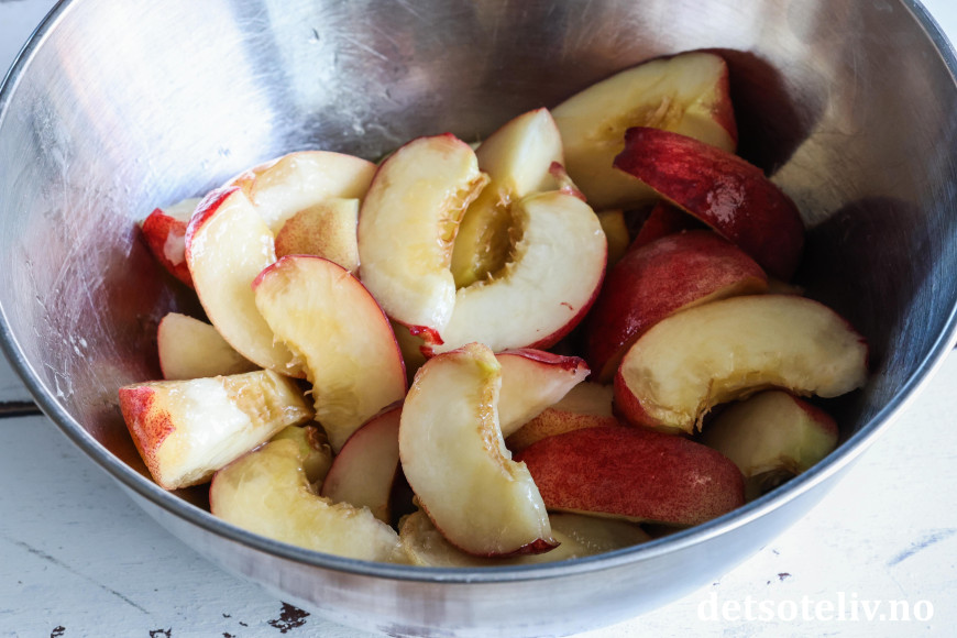 Rens fersken for stener og skjær dem i båter. Ha ferskenbåtene i en bolle og bland med presset saft av en halv sitron (dette hindrer misfarging).