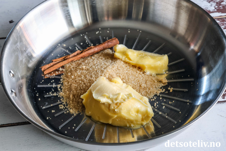 Ha smør, brunt sukker og kanelstang i en stekepanne.