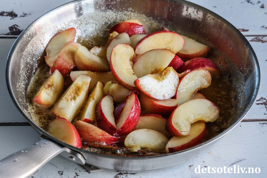 Varm opp slik at smøret smelter. Ha ferskenbåtene i pannen.