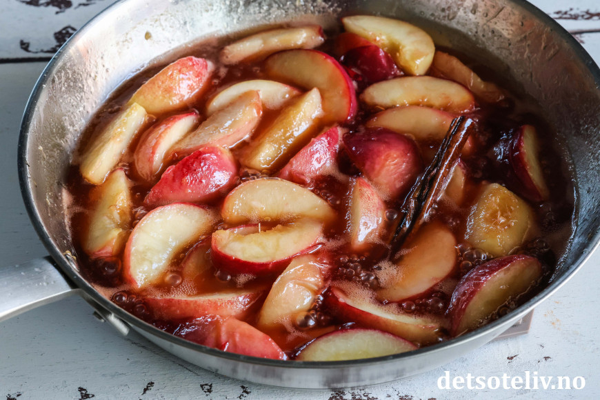 La de steke i ca. 5 minutter på middels varme så de blir karamelliserte. Du vil se at ferskenbåtene gradvis vil bli mykere og avgi væske.