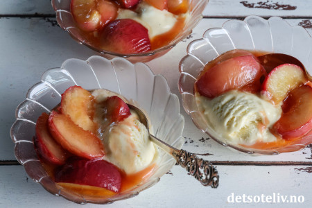 ♥ Karamelliserte fersken kan også serveres med vaniljeyoghurt eller vaniljekesam. De er også kjempegode med krem og pannekaker!