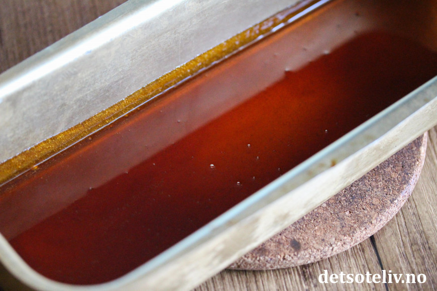 Finn frem en brødform som rommer 2 liter. Smelt 2 dl sukker i en kjele på svar varme. Hell det flytende, lysebrune sukkeret i formen. Snu og vend på formen så det smeltede sukkeret dekker hele bunnen av formen (vær litt rask, for det smeltede sukkeret stivner raskt). Sett formen til side.