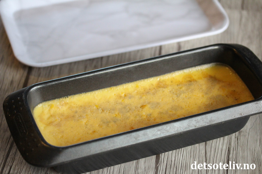 Varm opp ovnen til 120 °C og ha en langpanne midt i ovnen. Sett formen i langpannen. Hell kokende vann i langpannen så vannet rekker ca. 3 cm opp langs kanten av formen.