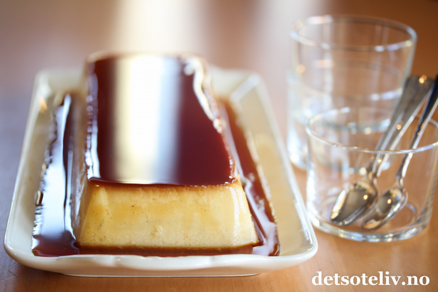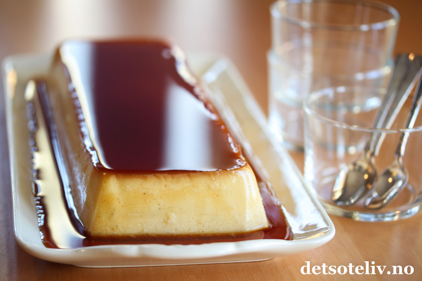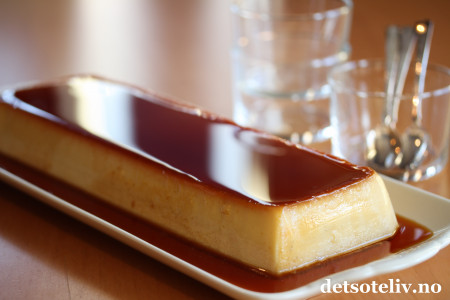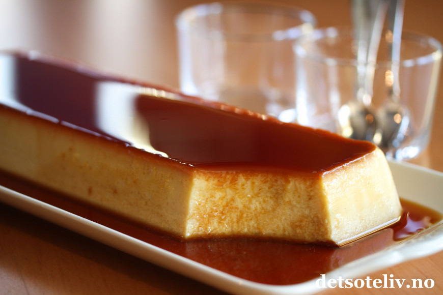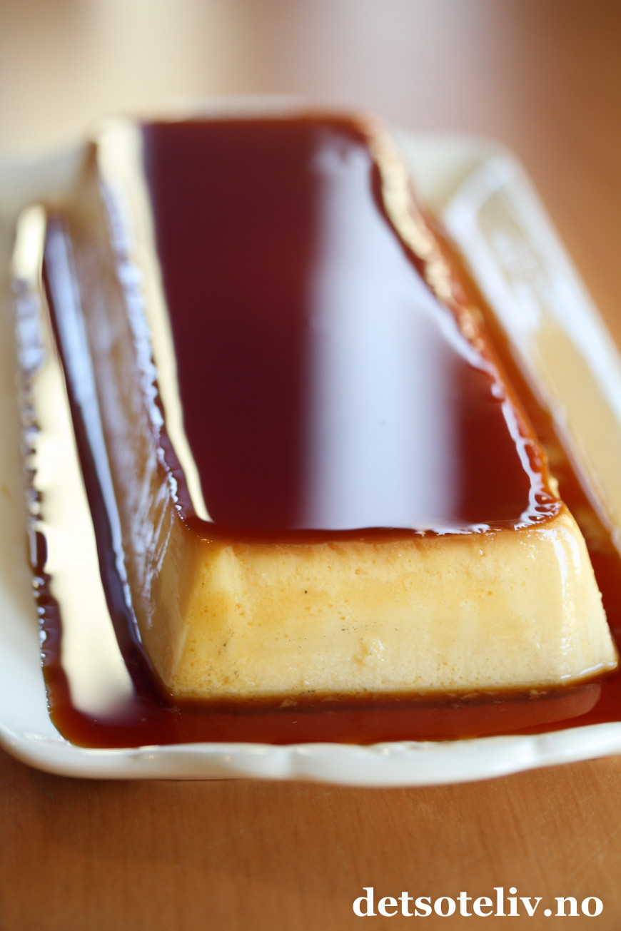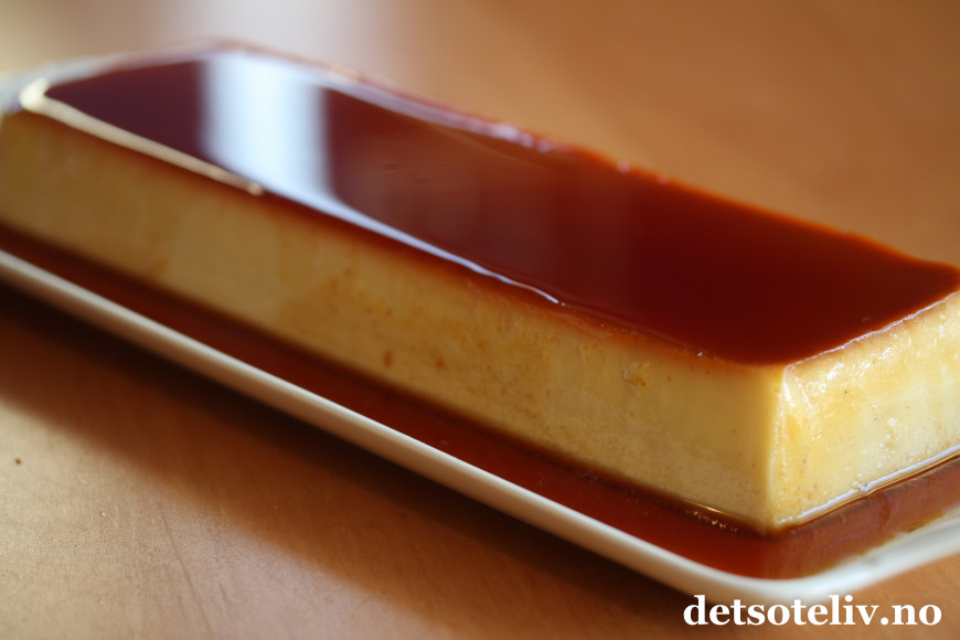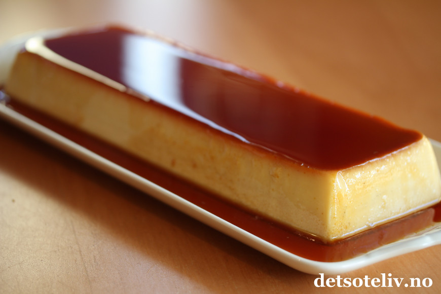 ♥ Husk at du må bruke et avlangt fat med kanter, for det er flytende karamellsaus i bunnen av formen som renner over karamellpuddingen og oppi fatet når du løfter av formen.