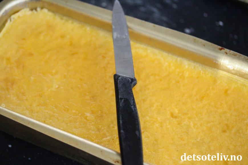 Dagen etter finner du først frem et passende avlangt fat som har litt høye kanter. Ta formen ut av kjøleskapet og løsne karamellpuddingen fra kantene av formen med en kniv.