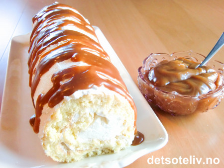 Pisk kremfløten og vaniljesukkeret til tykk krem. Bre 2/3 av kremen utover den kalde kaken. Rull sammen fra langsiden til en fast rull. Renskjær kantene og løft kaken over på et passende fat. Smør resten av kremen jevnt over overflaten av kaken. Ringle over karamellsaus til pynt.