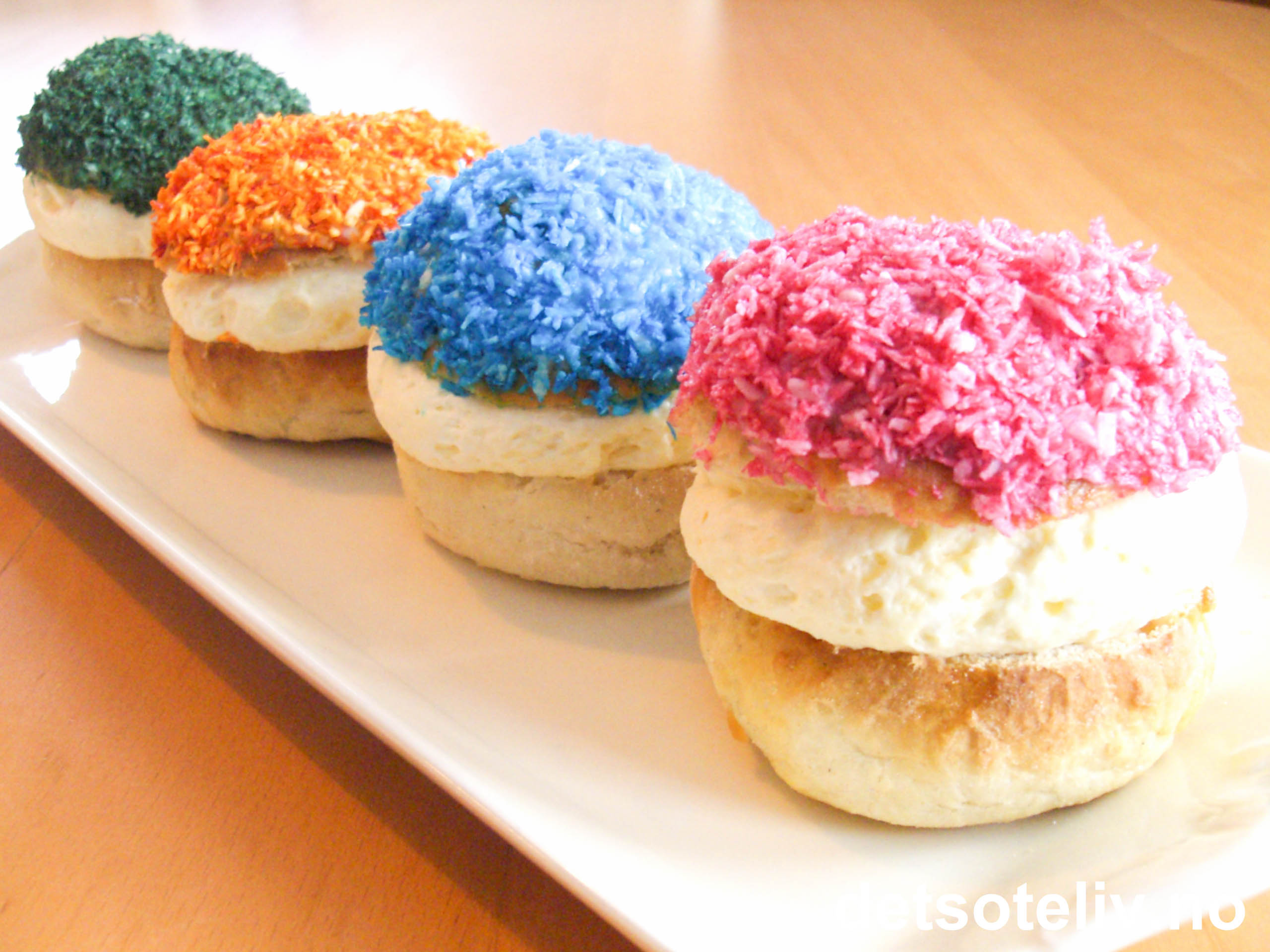 Før servering skjærer man av et lokk på bollene. Smør melisglasur på lokket og dypp lokket deretter i kokos som er farget med konditorfarge (se tips). La lokkene ligge å tørke i 15 min.