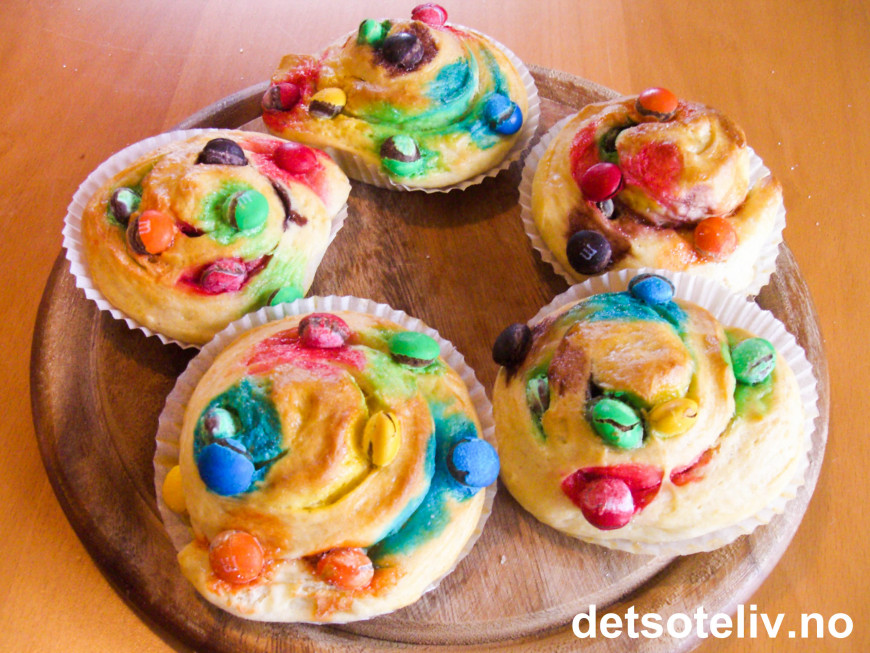 Ta deigen på bakebordet, eventuelt sammen med litt ekstra hvetemel, og elt den sammen. Kjevle deigen ut til et stort rektangel. Fordel over M&M's (se tips). Rull sammen deigen fra langsiden til en fast pølse. Skjær pølsen opp i skiver. Sett skivene i muffinsformer av papir (dette gjør at bollene holder fasongen bedre). Ha bollene på stekeplater og etterhev dem i ca 30 minutter. Stikk så flere M&M's ned i sprekkene på bollene, slik at du får M&M's som synes på alle bollene. (Disse kommer til å smelte litt under stekingen og avgi farge, slik at "Karnevalsnurrer" får utseende slik du ser på bildet.)