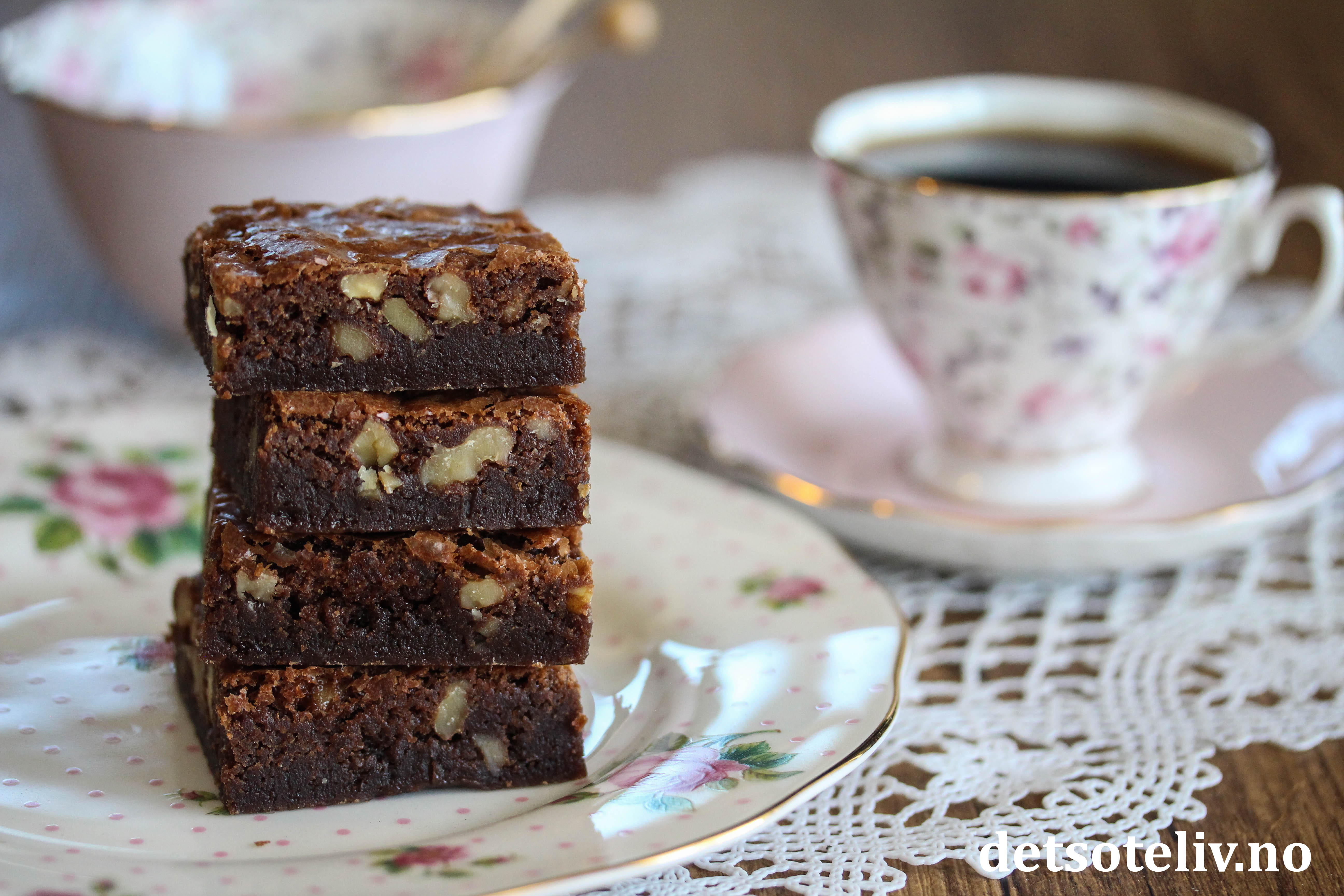 Smelt smøret i en tykkbunnet kjele. Ta kjelen av platen og tilsett oppdelt sjokolade. La sjokoladen smelte i det varme smøret. Ha så i sukkeret, eggene og vaniljeessens. Pisk massen med stålvisp til den blir luftig. Vend så i hvetemelet og grovt hakkede valnøtter.