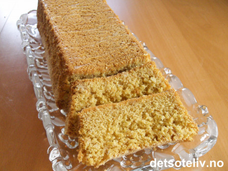 Hell deigen i en smurt brødform (1,5 liter) med bakepapir i bunnen. Stek kaken på rist midt i ovnen ved 160°C i ca 30 min. Avkjøl kaken en stund i formen før den løsnes fra formen med en skarp kniv og deretter forsiktig hvelves ut av formen.