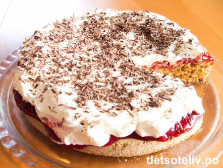 Dekk kaken med jordbærsyltetøy (se tips). Pisk fløten til krem og fordel kremen oppå syltetøyet. Pynt kaken med revet kokesjokolade. Oppbevar kaken kjølig frem til servering.