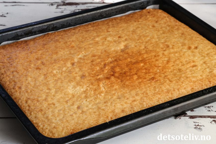 Stek kaken på nederste rille i ovnen ved 175°C i ca. 45 minutter. Avkjøl kaken i et par minutter i langpannen.
