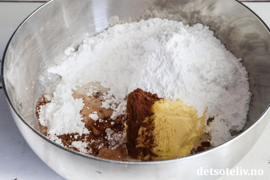 Ha mykt, romtemperert smør i en bolle. Tilsett de øvrige ingrediensene til sjokoladekremen.