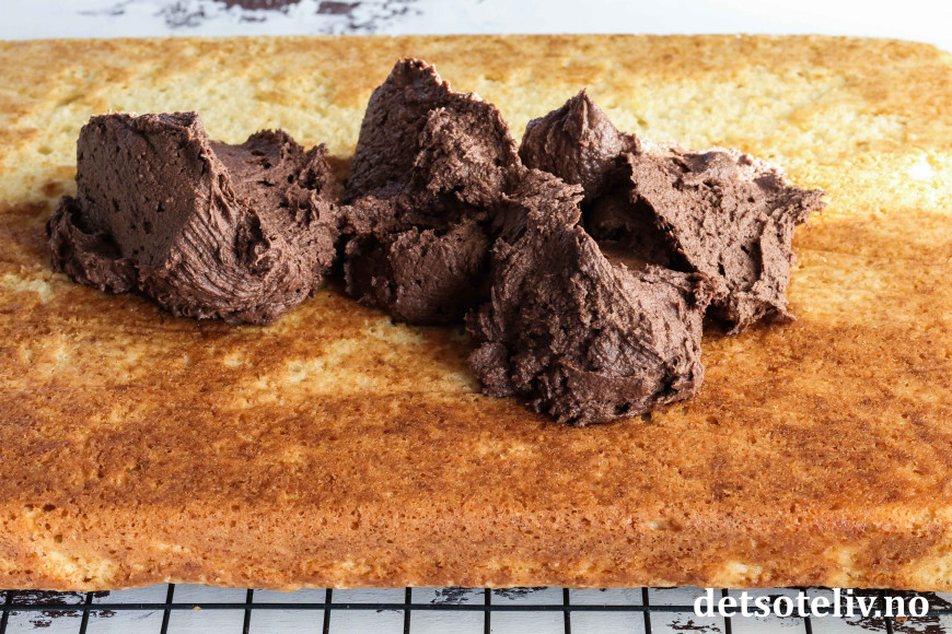 Smør sjokoladekremen over kaken i et jevnt lag.