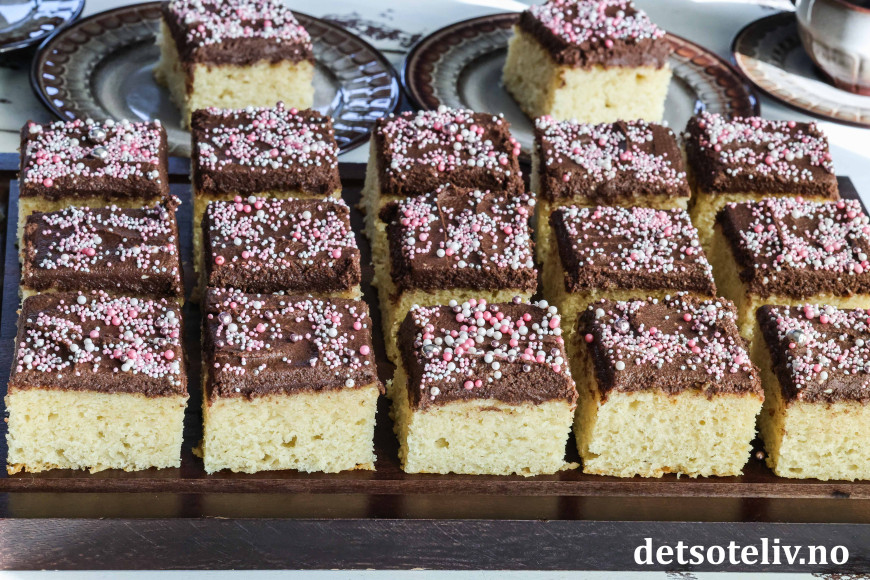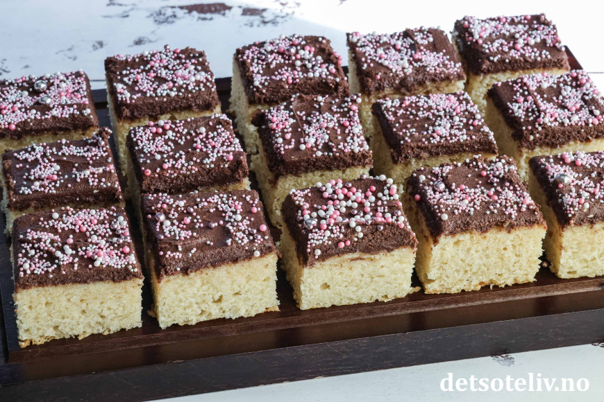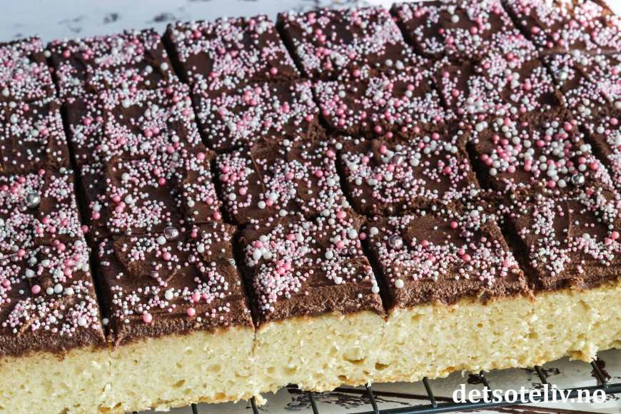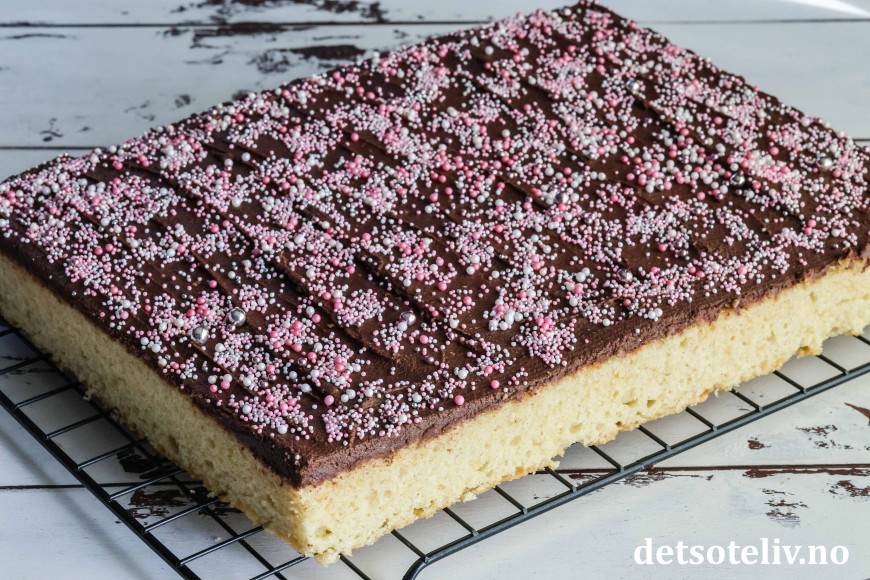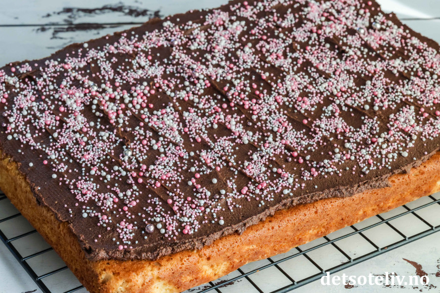 Kaken blir ikke mindre populær av å toppes med en deilig sjokoladekrem og fargerikt kakestrøssel!