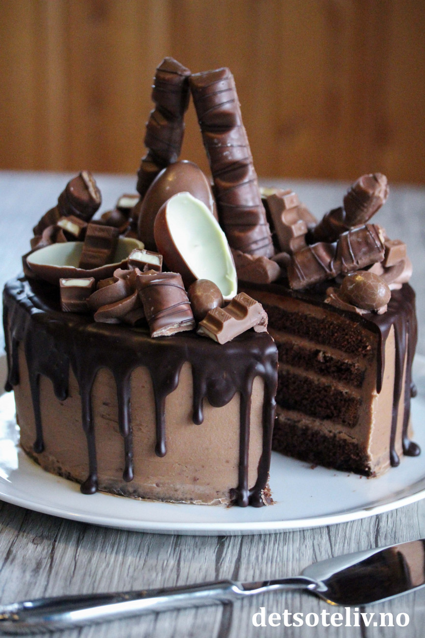 NB! Men det er selvfølgelig ikke nødvendig med drip-kant på denne kaken og det går fint å gå rett på å pynte kaken med Kinder-sjokolade!