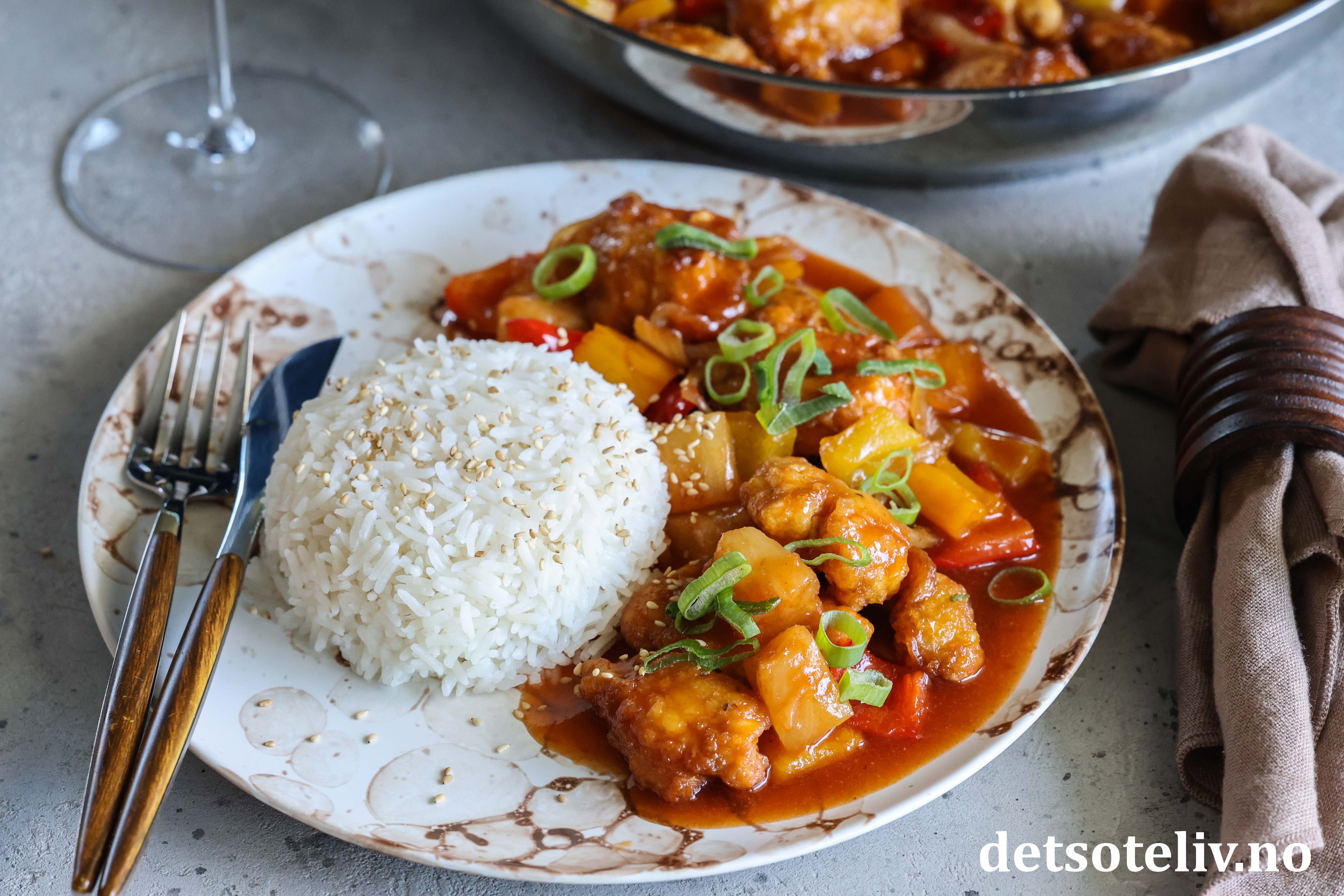 Jeg tåler ikke ananas, men elsker innbakt kylling i sursøt saus.