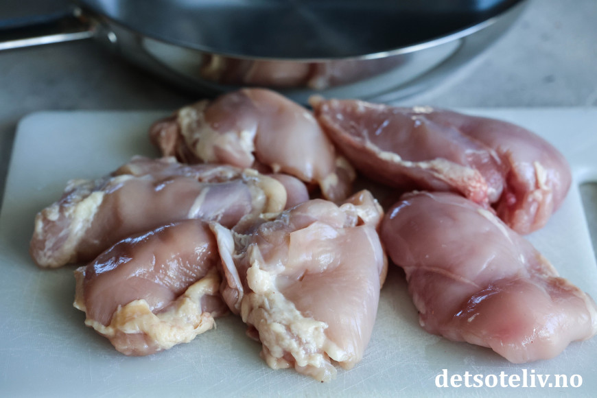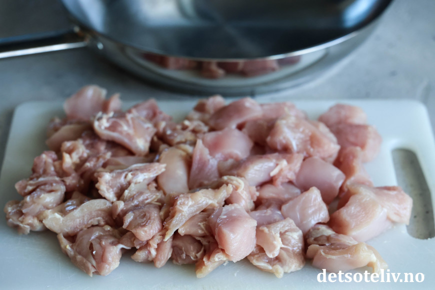 Finn frem kyllinglårfilet og/eller kyllingbrystfilet (jeg brukte en blanding). Skjær kyllingen i mindre biter (ca. 5 x 5 cm).