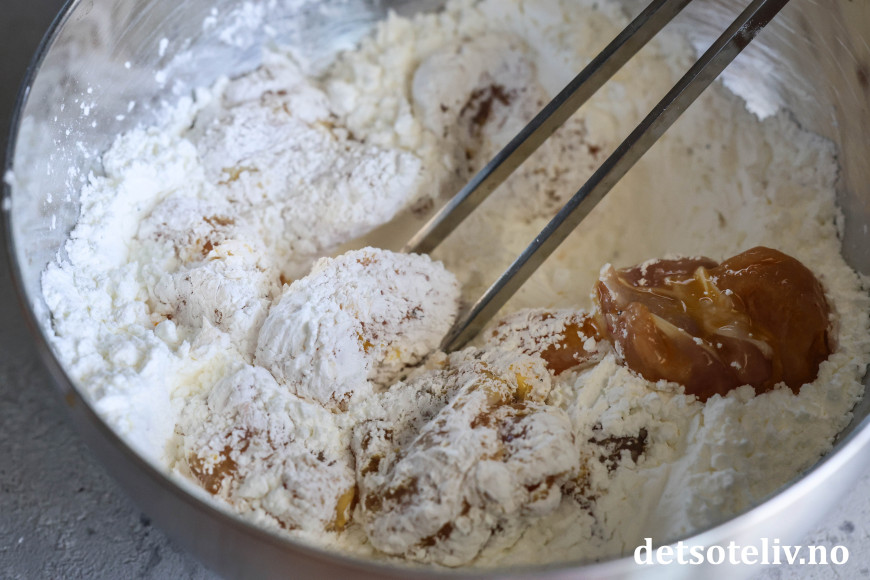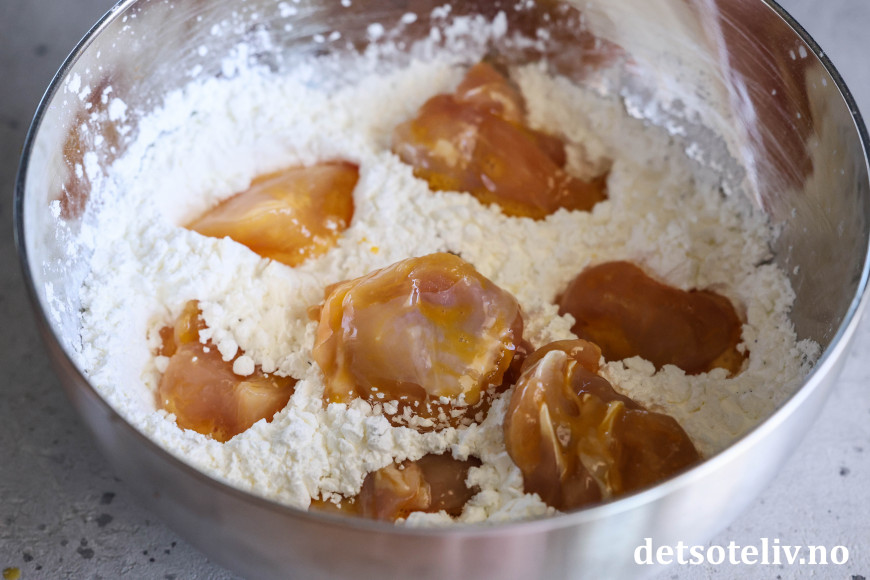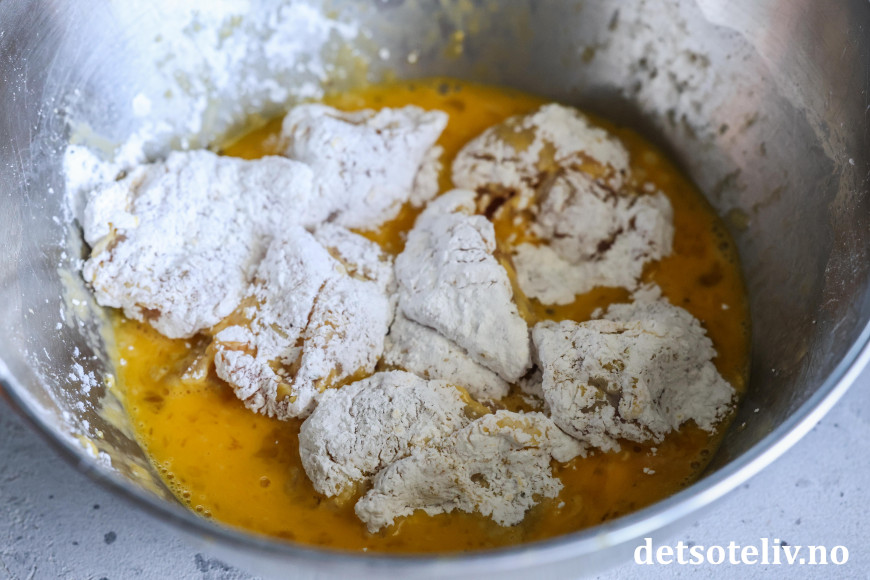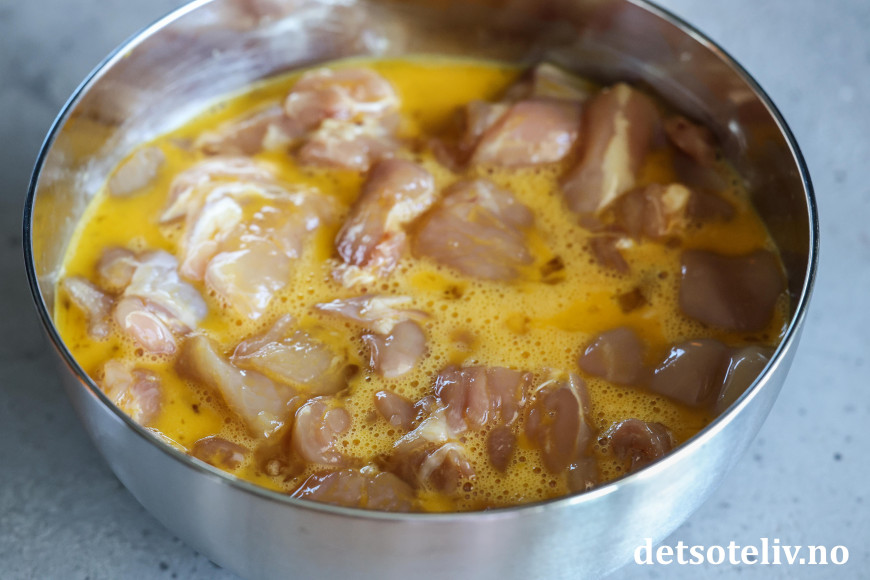 Ha kyllingbitene først i bollen med eggeblandingen.