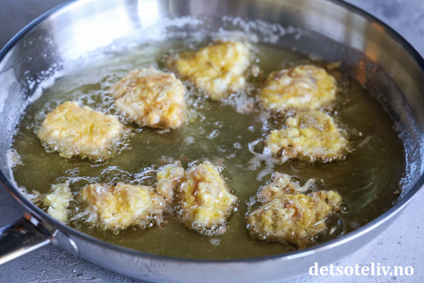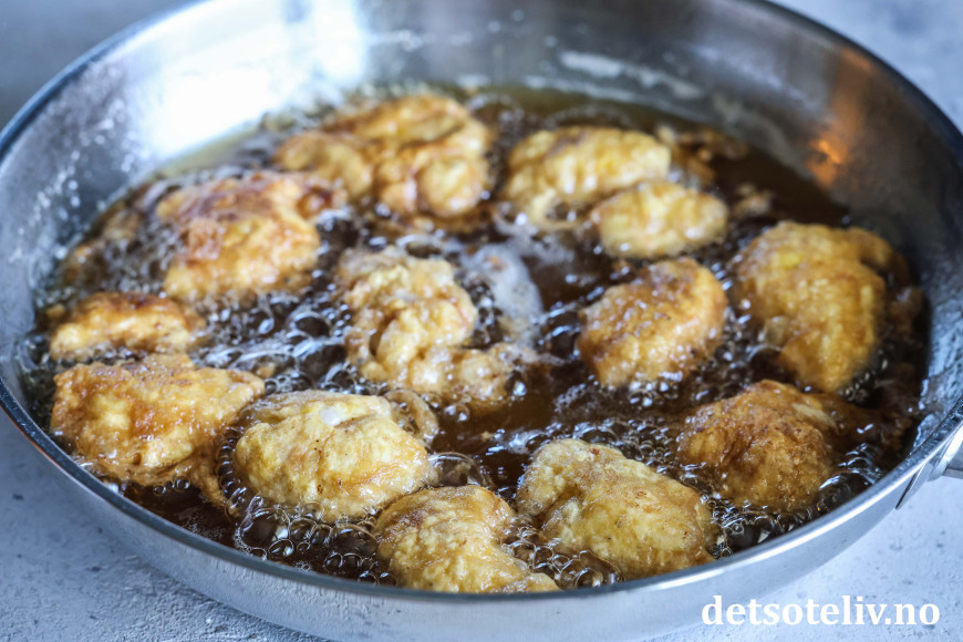 ♥ Til frityrstekingen har jeg her brukt peanøttolje. Det er en olje som tåler høy temperatur ved frityrsteking veldig bra, og jeg synes oljen gir en smak som passer veldig godt til denne retten. En annen god olje å bruke til frityrsteking er avokadoolje. Både peanøttolje og avokadoolje er imidlertid nokså dyre produkter, og er på ingen måte nødvendig å bruke for å få et godt resultat. Det går kjempefint å bruke rapsolje, solsikkeolje eller annen nøytral matolje til frityrstekingen. Du kan eventuelt bruke noe peanøttolje og supplere med rapsolje.