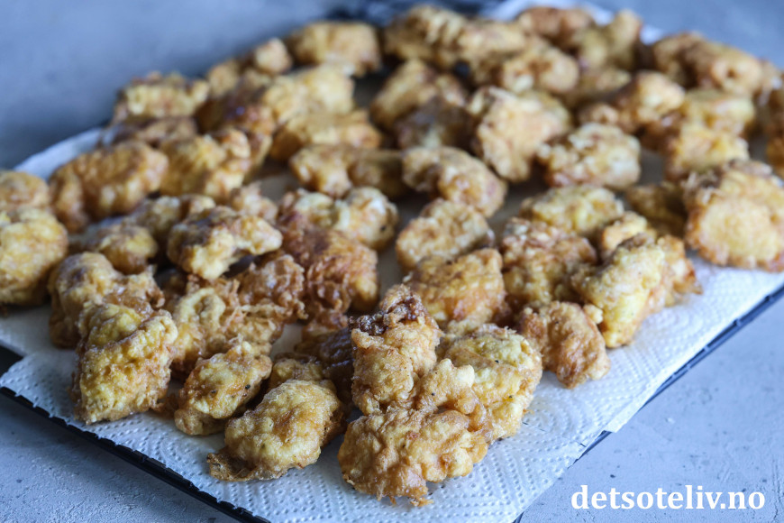 Når kyllingbitene er gylne og gjennomstekte legges de på et brett dekket med kjøkkenpapir.