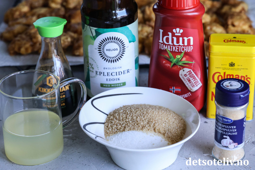 Finn frem ingrediensene til sausen. Visp sammen ananasjuice, hvitt og brunt sukker, eplecidereddik, ketchup, soyasaus, hvitløkspulver og sennepspulver. Rør ut maisenna i litt kaldt vann og visp maisennavannet deretter inn i sausen. Smak til sausen med kvernet salt og pepper.