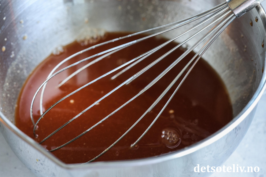 ♥ Det er meningen at sursøtsausen skal bli tykk og sticky, slik at den legger seg fint rundt de frityrstekte kyllingbitene. Dersom du imidlertid skulle synes at det er for lite saus etter at du har vendt inn kyllingbitene, kan du tilsette litt varmt vann for å spe ut sausen.