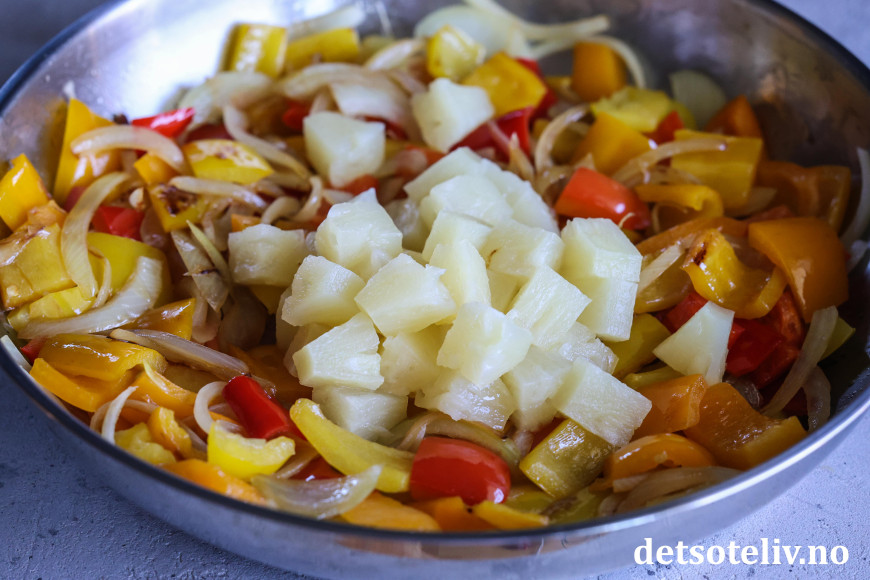 Stek på middels varme i ca. 5 minutter, til løken blir blank og gyllen og paprikabitene begynner å bli møre.