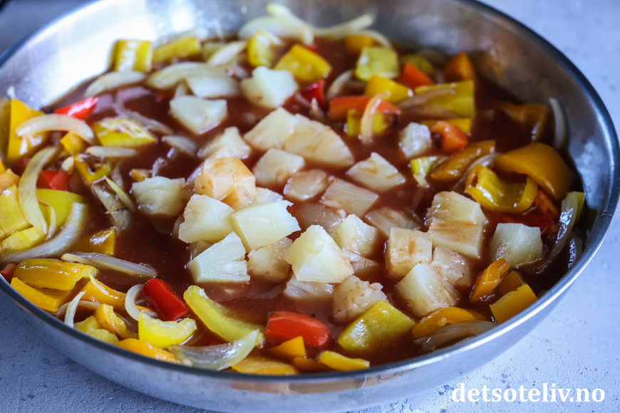 Hell sausen i pannen med grønnsakene og ananasen. Bland godt og vend deretter inn de friterte kyllingbitene.